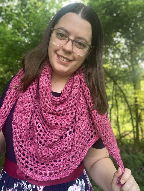 We especially love the crocheted Me&Ewe Shawl. This trapezoid shaped shawl is full of texture! The lacy mesh rows provide amazing drape, while the bobbles and fans of the solid sections bring gorgeous depth to the pattern. Designed by Tara Briggs using 3 hanks of Me&Ewe DK in color Viking Heather. The pattern is available for purchase on Ravelry.